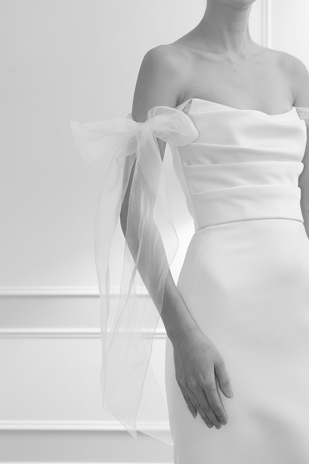 Boston – Italian double duchess draped bodice fit-to-flare gown with picot edged silk organza off-the-shoulder ties.