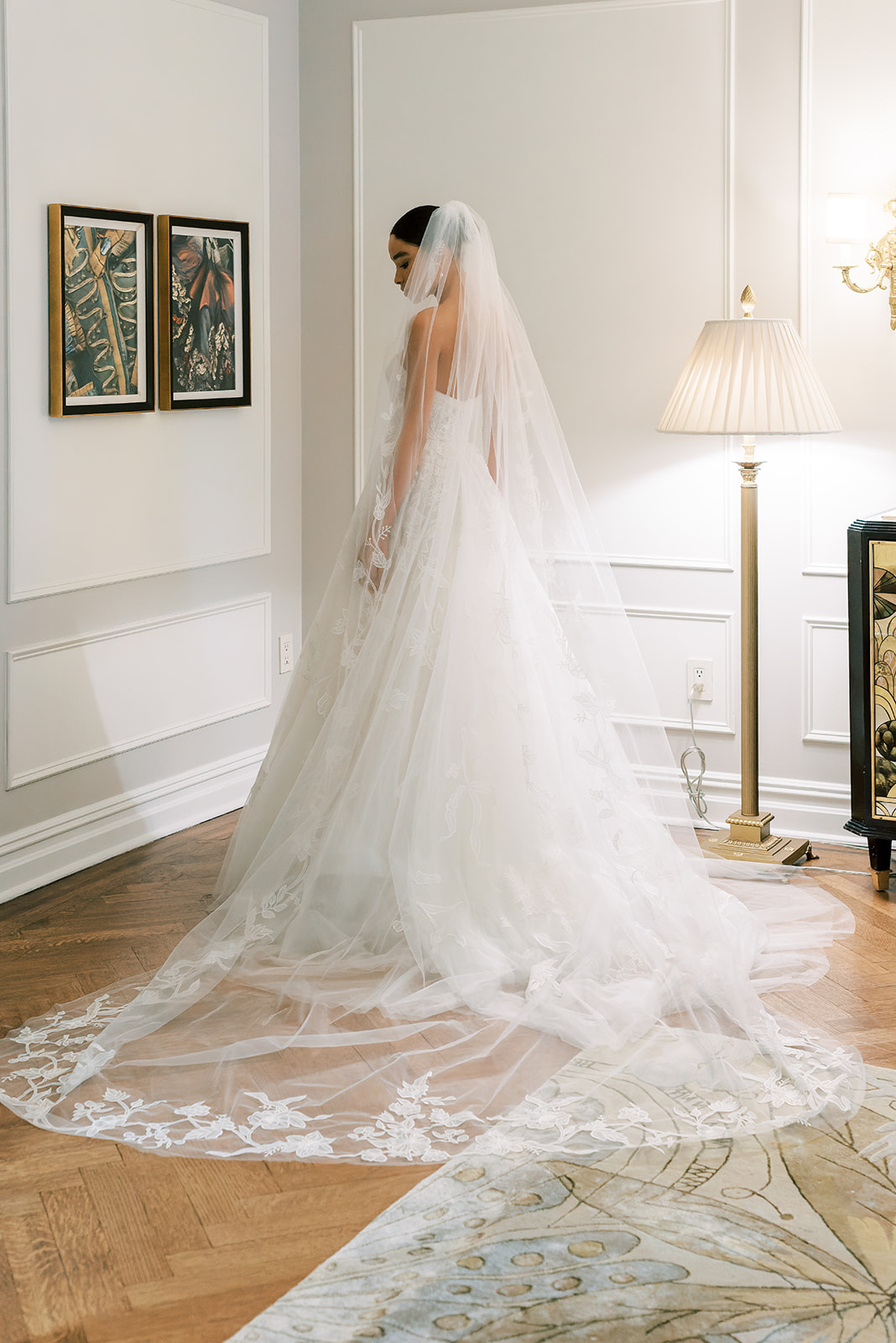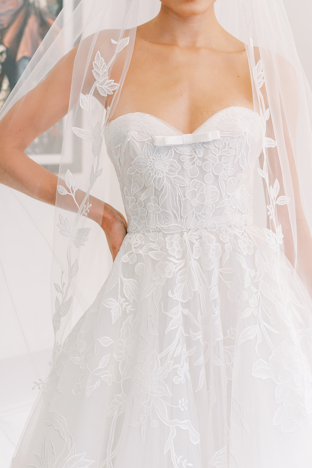 Lupe – Trailing floral embroidery strapless ballgown with soft ruched neckline and bow detail. Styled with trailing floral embroidery cathedral veil.
