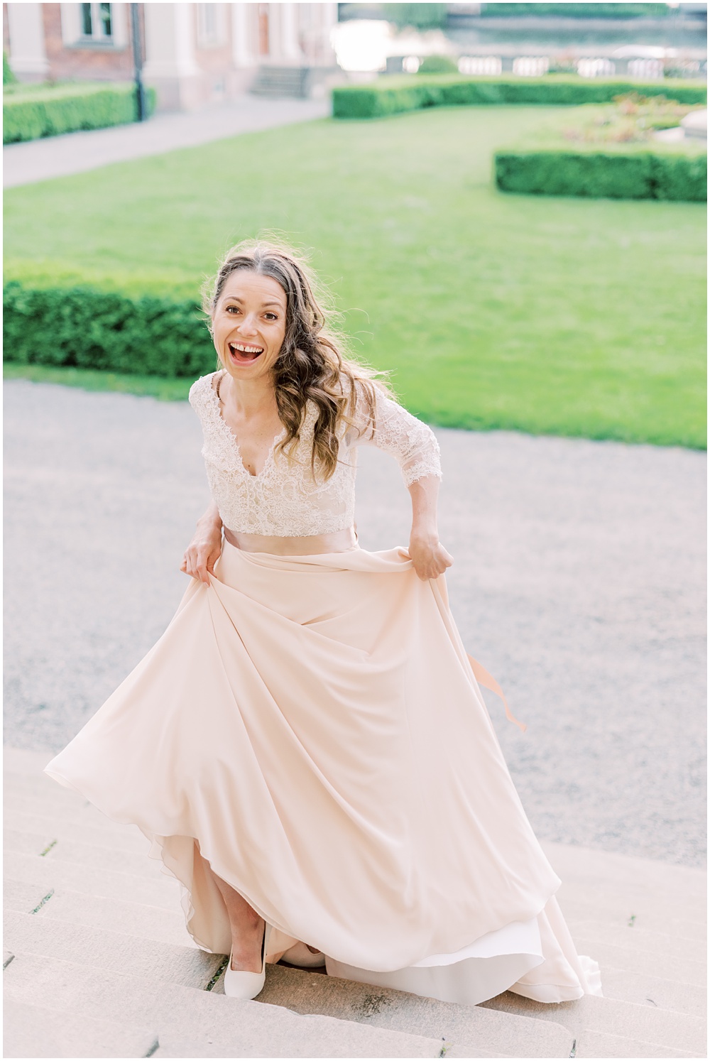 When Sara went outside to enjoy the last rays of sunshine that slowly set over Riddarfjärden and the the late golden hour sun rays hit Sara. She looked like a modern, powerful goddess walking down the stairs with her flowing, light apricot wedding dress, her sweeping overarm wedding bouquet, her bespoke Grace morganite ring with and a big smile on her lips.